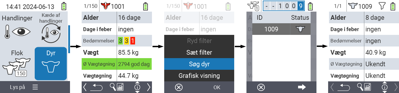 Inden for hver informationsvisning har du mulighed for at søge efter et dyr, indstille et filter og skifte til en grafisk visning. Du kan også skifte mellem de enkelte dyr når som helst ved hjælp af piletasterne ◁ ▷.