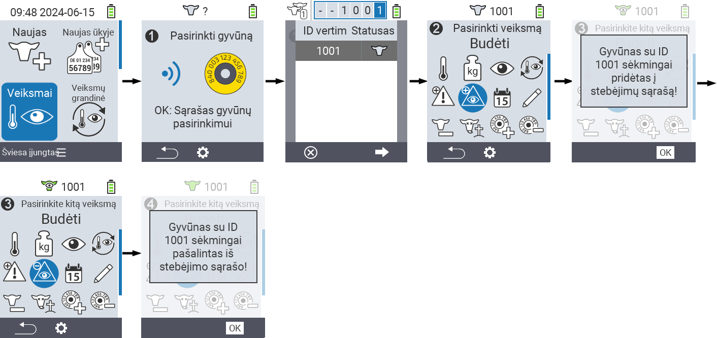 Veiksmaiir paspauskite mygtukąOK.Nuskaitykite gyvūną naudodami transponderį arba pasirinkite gyvūną iš sąrašo. Patvirtinkite su